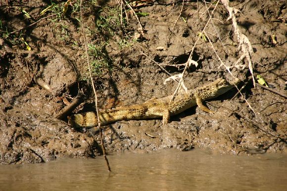 Der Weg zum Boot ist genau so glitschig wie gestern, aber alle kommen relativ sauber ins Boot. Zuerst geht es wieder durch den engen Flusslauf. Auch heute wieder viele Eisvögel und Chacas. Leider sind sie zu flink, man schafft es nicht, sie aufs Foto zu bekommen. Kaimane sind wahr-scheinlich Langschläfer, heute morgen bekommen wir nur wenige zu sehen. Und Tony macht erst gar keine Anstalten, ein Tier zu fangen. Heute erschrecken wir auch nicht mehr, wenn wir mit dem Boot über Baumstämme schrammen, die unter Wasser liegen. Wie schnell man sich doch daran gewöhnt. Und auch Susannes Kommandos 'Bäume links' und 'Bäume rechts' klappen gut. Es bedeutet immer für die jeweilige Seite, den Kopf einzuziehen, weil Äste oder Zweige ins Boot schlagen. So machen wir manche unfreiwillige La-Ola-Welle.