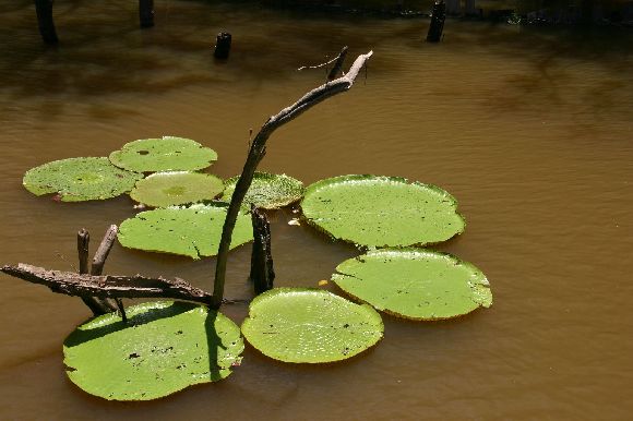 Es geht an ärmlichen Siedlungen mit Holzhütten vorbei. Dann wird an einer Insel angelegt. Es geht erstmal über einen Steg, der für südamerikanische Verhältnisse aber sehr stabil ist. Er wackelt nämlich nur ein bisschen. Es geht weit in ein überschwemmtes Gebiet hinein, dass bei Hochwasser (so auch im Juni dieses Jahres) total überflutet ist. Und dann sehen wir die berühm-ten Seerosen, deren Teller einen Durchmesser von bis zu 2 m erreichen können. Ganz so groß sind diese hier zwar nicht, aber trotzdem imposant. Blütezeit ist März und die Blütenfarben sind weiß, rosa und rot.