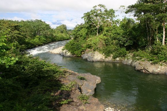 Nach kurzer Fahrt bestände die Möglichkeit zum Baden/Schwimmen. Aber es sind zu viele Sedimente im Wasser. Bei der braunen Brühe hat keiner Lust. Also geht es weiter stromabwärts. Der Alto Madre Dios hat eine Fließgeschwindigkeit von 20 km und mehr. Er ist etwa 200 m breit, weitet sich aber in der Regenzeit auf 700 m aus. Die Landschaft nimmt mich schon in ihren Bann. Üppiger Regenwald mit allen möglichen niedrigen und hohen Pflanzen. Als der Kapitän anlegt, bedeutet das für uns, aussteigen und Gummistiefel anziehen, vor allem wegen der Schlangen. Über das Ufergeröll geht es zu unserer ersten Dschungelwanderung.
