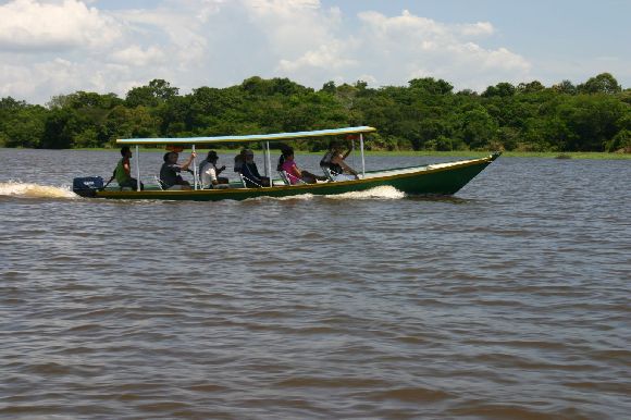 Heute steht unser Ausflug 'Meeting on the waters' an. Wir werden um 08.30 Uhr im Hotel abge-holt. Mit von der Partie ist ein brasilianisches Paar, das aber unterwegs bis zum Hafen noch zweimal einkaufen muss. Im Hafen sammelt unser Guide Ali (so dürfen wir ihn nennen) eine bunte Gesellschaft um sich. Wir sind die einzigen Deutschen, sonst fast nur Brasilianer. Aber Ali kann englisch und sogar ziemlich gut. Für mich ist es etwas schwierig, da die Erklärungen nur auf portugiesisch und englisch erfolgen. Manaus liegt ja streng genommen am Rio Negro. Etwas stromabwärts treffen der Rio Solimoes und der Rio Negro zusammen und ab da heißt der Strom dann Amazonas. Von Manaus sind es noch gut 1.000 Meilen bis zum Delta am Atlantik.